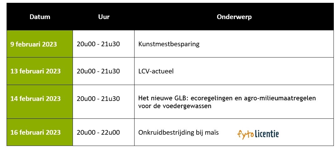 Het Departement Landbouw en Visserij, het Landbouwcentrum Voedergewassen (LCV) en de lokale partners nodigen u uit op een reeks online studiedagen.